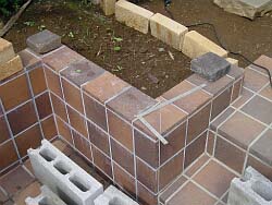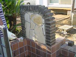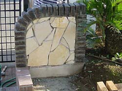 −ジェラストーン アプローチウォール編−工事期間:2003/9/23〜10/4マッスる度:40% 小細工度:80% <作業前> 実は庭の植栽を大幅に変更してからアプローチを入ったところから庭が丸見えになっていた。 そこでエントランス手前にアプローチウォールを作成し、目隠し+遠近感強調で庭を広く見せるという技を使ってみることとした。 <作業前の葛藤> 軽量ブロックを基礎にジェラストーンアプローチと同様に枕木色の黒いレンガで装飾し、同一イメージで統一することとした。 しかし、折角プロに貼ってもらったレンガの上に作成するだけに失敗は許されない。更にアンカーを打たないと何かの拍子に倒れたりして・・・・ドウスル? |