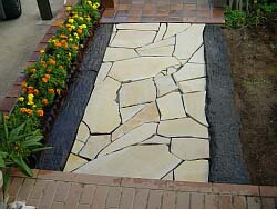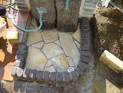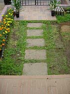 −アプローチ ジェラストーンペイピング編−工事期間:2003/8/2〜8/23マッスる度:70% 無謀度:90% <作業前> クローバーぼうぼう+ありきたりな和風天然石ステップストーンのアプローチ。 雨が降ると当然の様にドロドロでせっかく貼ったゲート廻りのレンガもドロドロに。これはいただけない。 <作業中の様子> 初めてのDIYにもかかわらず、無謀にも枕木&ジェラストーン(天然石)のコンビでのペイピング(舗装)に挑戦。 真夏の日差しがガンガンに照りつける中、枕木の重量にシビレ、更にジェラストーンのカッティングには意識もうろう。 さらにモルタルが足りず、作業途中の買い出しも数回・・・・ |