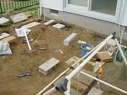 −枕木立水栓&ジェラストーン水受け編−工事期間:2003/10/4〜10/20マッスる度:90% ノミ技術習得度:100% <作業前> 現状、庭の水場といえば散水栓しかなく、何をするにも腰を屈めて操作せねばならず、非常に使いづらかった。 <作業前の葛藤> 監督(妻)の希望で既存の散水栓をぶち壊し、立水栓を製作することになった。設置位置は前回作成のアプローチウォールの家側の面になったのだが、いまいち気乗りがしない。 なぜならばこの工事を完了させるには ・既存給水管を掘り出して、配管を繋ぎ直す。 ・排水管を立ち上げ、雨水枡まで引っ張る。 という難関(共に未体験ゾーン)をクリヤしなければならない。更に予め庭に埋まった配管の位置関係を把握しておけばならないだろう。 まさに「言うは易し」なのであった。 |