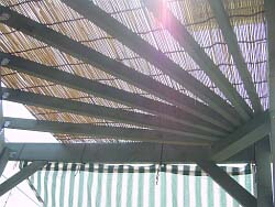 −異型パーゴラ編−工事期間:2004/4/26〜5/9マッスる度:50% 助手が欲しい度:80% <作業前> 枕木テラスの庭はBBQガーデンとして接待その他に大活躍だが、晴れた日には非常に日差しが厳しく、油断してビールなどを飲んでいると熱中症になりかねない状態である。 と、同時にご近所にも期待されている関係上、庭にインパクトのあるオブジェクトが欲しくなってきた・・・というわけで一気にパーゴラを作成することとなった。 <作業前の不安> 基本的なデザインは3本脚の変形パーゴラに決定。これには柱に囲まれていることによる閉鎖感を払拭するという意味合いと、変わった形状にすることにより見る者にインパクト与える狙いを込めた。 しかし、強度的に問題が無いのかがやや不安。 あれ?それ以前にこれまでに木工なんてやったこと無い様な・・・不安倍増。さーて、丸ノコ買って来よっと。 |
