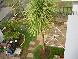 −園路ペイピング編(第一期)−工事期間:2004/10/26〜12/19マッスる度:90% 腰が痛い度:90% <作業前> 駐車場奥の物置へと続く何も無い通路。 監督はここをハーブガーデン(風)にしたいらしい。 しかしこの場所は天然のシダが多数生息根付いているらしく、刈っても刈ってもすぐにシダガーデンになってしまう。土壌改良と共に舗装をしないとハーブガーデンになりそうもない。 えーい!仕方が無いということで作業開始! <作業前の不安> 雑草群の撲滅のためには舗装してしまうのが手っ取り早いのだが、水を通さない様な舗装では土が死んでしまいそうだったので、ジェラストーンのステップ&縁取りとレッドロック(赤い軽石)の組み合わせでいくことに決定。 さて、縁取りをジェラで行うということは基礎になるコンクリ用の型枠工事を行う必要がある。型枠などやったことが無いし、全体のレベル出しも面倒そうだと思い、実は企画倒れ寸前(数ヶ月放置)だったこの工事なのだがあるアイデアで一気に形になるのだった。 |