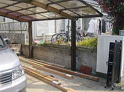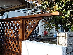 −ラティスウッドフェンス編−工事期間:2005/4/28〜5/24マッスる度:70% テクニカル度:90% <作業前> 監督からこんな意見が出た・・・「うちの庭がキレイになってもアレがねぇ」 実際あまり書きたくないのだがここで言う”アレ”とは・・・隣人宅の庭である。この家に越してから3年弱の日々が経過したわけだが、その庭は荒れ放題のまま改善の兆しが無い。隣人とのお付き合いも殆ど無いのでその辺の話題に触れることも無く今に至った訳であるが”荒れ具合にもほどがある”ってな訳で我慢の限界に達した監督から遂に”隠蔽工作”のミッションが下された。 <作業前の不安> 前々回の異型パーゴラで身にしみたのだが、基本的に木工細工は苦手である。切断&組み立てを繰り返すうちに微妙に狂ってくる寸法をどこで逃がすかが腕の見せ所なのだが、なかなか思うように行かないのだ。 特に今回のミッションでは既製品のラティスフェンスを使用という条件が付いているため、そいつの狂いも計算に入れなければならない。更にブロック塀上に設置となると、塀の狂いも考慮に入れねば・・・。本当に気が進まないのだった。 |