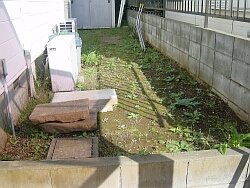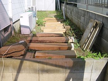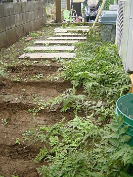 まずはステップ代わりに枕木を置いてみた。 だた置くだけでは芸が無いので地面と面いちになるように埋めてみたのだが・・・いまいち。 (´Д`;)そのまま数ヶ月の放置プレイのおかげですっかりシダが茂っていますね。。。 |