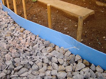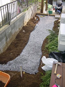 砂利が地面に沈んでは困るので基礎の下に草防止用のシートを敷く。 そして砂利投入。土嚢袋6袋は腰に大ダメージを与えるには十分なので慎重に作業を行った。 |