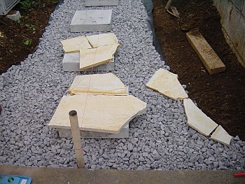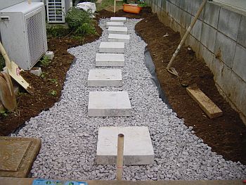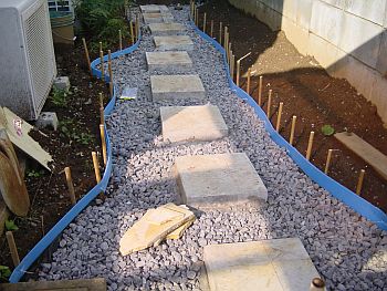 砂利を敷き詰めたら、ステップの位置を確認。ステップのベースにはコンクリ板を使用する。 デザインは駐車場から見た場合の遠近感を強調するためにこの様な形となった。 一番上の写真と比較するとその効果は歴然! |