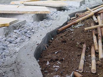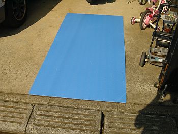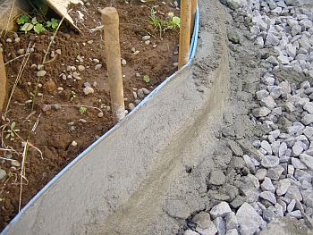 お次はエッジ部分の型枠作りだが、通常型枠と言えば木で作るものですよね? この型枠作業が面倒そうなのでこのペイピング工事が放置されていたのだが、 あるアイデアで一気に形となった!! ここからは私の編み出したオリジナルの施工法ですのでもし真似して失敗しても責任を持ちませんよ〜 @まずは30cmくらいに切った篠竹をエッジに沿って地面に刺していく。 A次に右の写真のようなポリウレタンの養生板を用意して5cm位の細切りにする。 |