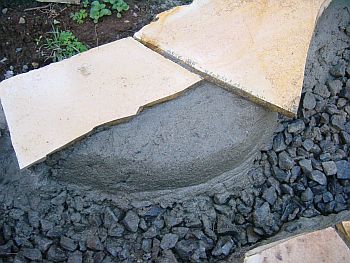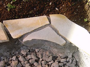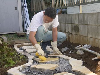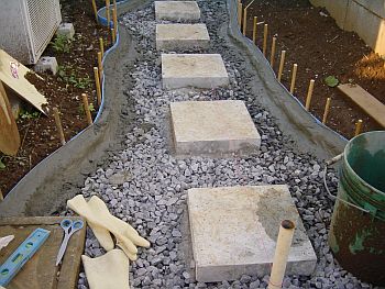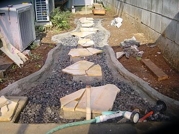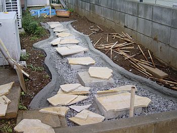 雰囲気を確認するためにジェラストーンを仮置きしてみる。うーんこんな感じかな?? そしてステップ基礎のコンクリ板をレベルを出してから、しっかりモルタルで固定する。 私が何故コンクリ板を基礎に使うのかと言うと、そのほうが全体のレベルを合わせやすい (様な気がする)からです。プロの方から見れば謎の施工方法かもしれませんが、 そのあたりの突っ込みは禁止ということで。。。 |