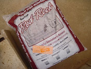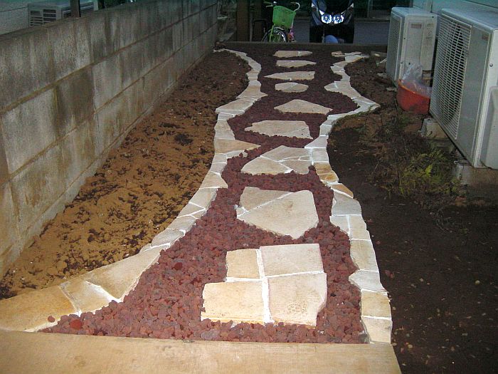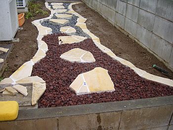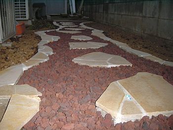 目地が乾いたら装飾用の砂利を入れる。今回使用したのはREDROCKというアメリカ産の軽石である。 踏むと防犯砂利の様な音がする(と言うより防犯砂利そのもの?)のだが、1袋700円弱で購入できる。 |