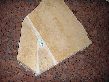 今回の工事では防犯砂利(違うって!)は4袋使用した。 ここはケチらずに大量投入したほうが高級そうな仕上がりになるのでガンガン入れた。 遊びで一番手前のステップのみ子供のビーダマを埋め込んである。 猫はコイツの光り方が気に入らないらしく避けて通っているのを目撃したので、猫よけに良いかも・・・ ちなみにこの石にはくらげの様な化石が入っており、彼は娘に”ヒョロヒョロ君”と名づけられている。 |