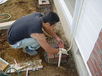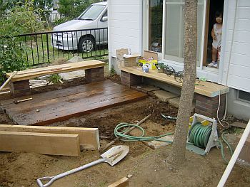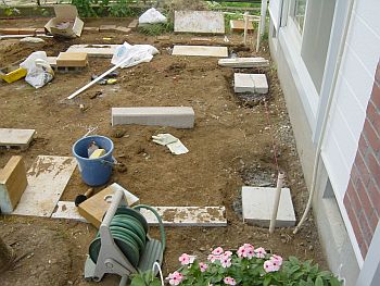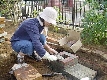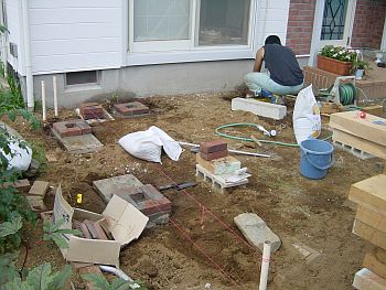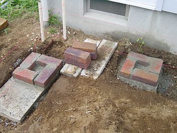 大勢でBBQと言えば椅子が必要だ〜ということで、濡れ縁も兼ねたベンチを作成。 ありきたりではつまらないのでベンチの脚はレンガを積んで作ることになった。 ベンチの脚となる位置に穴を掘り、砕石を詰め、突き固めた。 その上に捨てモルタルと何故か庭に転がっていたコンクリ板を置いて基礎とした。 |