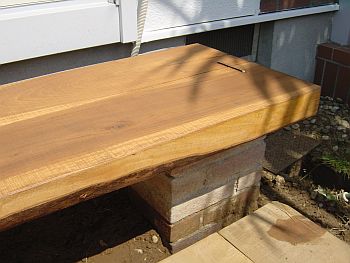 目地入れは監督(奥さん)に手伝ってもらった。 そして完成。天板はイペのハーフ枕木をサンダーで丁寧に削って使用。 イペは腐りにくい素材だが、見た目重視で仕上げにはステイン系の塗料を塗った。 脚のスパンはかなり離れているが、さすがは枕木。全く撓むことはない。 また、レンガの脚に負けない重厚感もなかなか良いと思う。 |