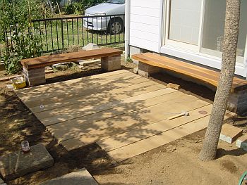 ベンチはこんな感じでL字型に配置。水糸を張って作業を進めた。 |