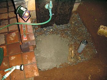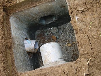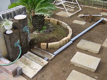 コンクリの雨水マスは石工ハンマーで側面を叩くだけで簡単に穴が開く。 ここに排水管を差し込んで設置。 地面を掘っていたら現れた給水管の下を通して排水管の傾斜は約1/50とした。 |