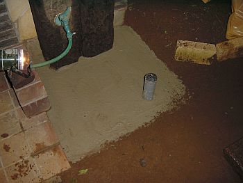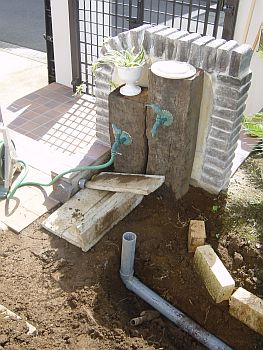 これからモルタルを敷くので埋まらない様にという配慮で 水受け側はとりあえず余分を切らずに煙突状に立ち上げておく。 |