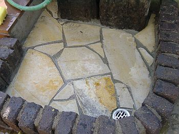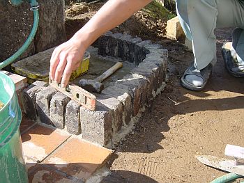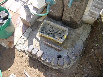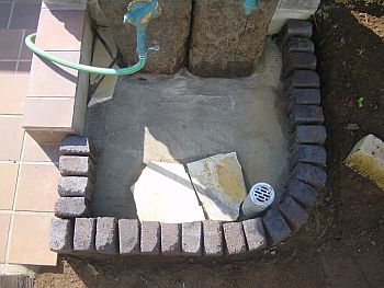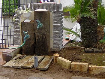 排水管をツライチでカットしたのはこの目皿を装着するため。 こいつでジェラストーンの厚み分を吸収します。 早速縁の部分のレンガ積みを開始。 使用したレンガはアプローチウォールを作った時に出来た半欠けの物。 |