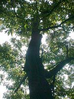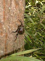 | こんなに立派なクヌギの木を発見! そこに現れた羽化したてのと思われる巨大カブト虫。 |