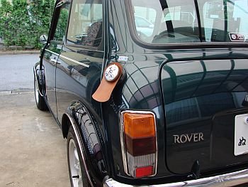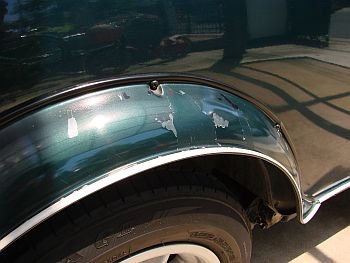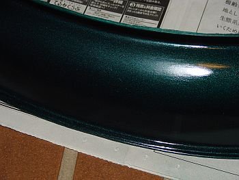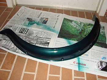 クリアもROVER純正を使用したが、更なるガス圧不足が発生。 ホルツのクリアを使えば良かった・・・ クリア乾燥最中に大雨警報発令! 雨が降る前に部屋に非難したものの、臭いが・・・(汗) ガス圧不足の関係で実はちょとクリアがタレてますがとりあえず完成。 艶々でなかなか良い感じに仕上がったのだが、今度はネジ穴の周囲のFRP本体にひび割れが発生・・・Orz まあ見た目は随分良くなったので満足か。 |