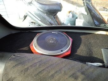車体側に取り付けて完成! トランク側から蝶ナットで固定した。 大した値段のスピーカーではないが、低音にメリハリが出ていい感じ。 通勤が楽しくなるね! |