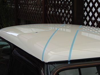 クロス部分とブルーの部分の比率を割り出し、テープでルーフに暫定の位置出し。当然センター出しには気を使った。 位置が決まったところで、カッティングシートの型紙を模造紙を使って現物合わせで作成する<写真なし>。 |