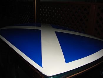 当日の作業は以下の通り・・・ 6:00 ルーフワックス落とし&磨き 7:30 スコットランドの国旗の比率を計り、miniのルーフにデザイン 8:30 カッティングシートを切り出す為の型紙を模造紙で作成 10:30 ジョイフル本田千葉NT店にカッティングシートを買出し 11:00 カッティングシート4枚切り出し 12:30 昼飯 13:30 ドライヤー片手に運転席側貼り 14:30 助手席側貼り 15:30 リア側貼り→シワ入り失敗 ルーフ後端のアールがきつ過ぎてカッティングの限界を超えている模様 16:00 リア側カッティングシート 寸法変更&再切り出し 16:30 リア側貼り 17:30 フロント側貼り 雨降ってきたよ〜 18:30 完成! |