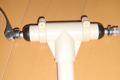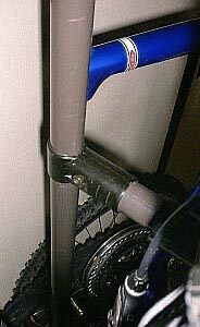 Fフォーク固定部詳細写真。 Qレリーズで挟み込んでいる半球状の物体はイレクターパイプのOPパーツのゴム足の穴を拡げて使用しているらしい。 |