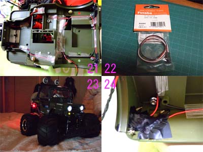 配線図の様にボディの裏に線を流します。(画像21) 受信機用のコネクターに結線して完了です。 画像コネクターはサーボ用の為、赤・黒・白の3本線ですので白線をはずし赤・黒のみ使用します。(画像22) 実際点灯させて見ると、ボディの位置が高い為、裏から光が漏れてカッコ悪い・・・。(画像23) そこで裏から黒のカッティングシート(できるだけ柔らかい物)を貼り、漏れを抑えます。 塗料等で塗ると消灯時に黒ずんで点灯時にムラがでてしまうのでお勧めできません。(画像24) |