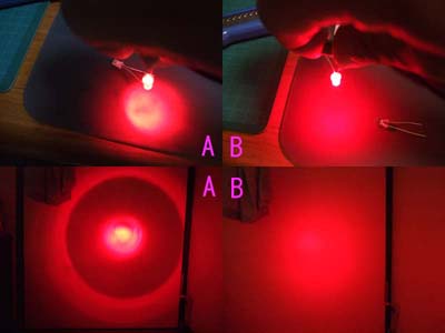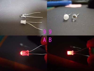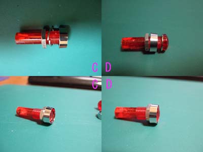 パイロットランプの穴が小さいので5mmLEDの場合は削ります。 発色を良くする為と2Vですので赤のLEDをお勧めします。(画像9) 画像A,Bを見比べて見ますと加工前のAより、加工後のBの方がテールランプの光に適しています。 白も試しましたがピンクっぽくなってしまうのと、3Vですから却下しました。 画像Cは真ん中のスプリングワッシャーをそのまま組んだ状態でメッキ部分より赤色の部分が中に入ってしまう為、 画像Dの様にメッキ部分と赤色の間にスプリングワッシャーを入れた方が ほんの少しだけ赤色が出て真横から見ても光が見えます。(お好みで・・・) |