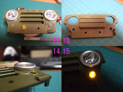 スモールランプはボディのウインカー部の出っ張っている部分をヤスリ等で削り落とし フラットにしてLEDの大きさに穴を開けます。(画像12) 次にLEDが1mm程度飛び出る方がリアルですので裏から皿堀をしてLEDの出を調節し LEDをSuperXで固定して取り付け完了です。(画像13、14) 発光させるとこんな感じです。程よい明るさです・・・。(画像15) |