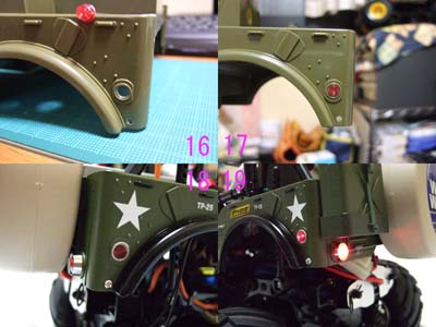 サイドマーカーは逆に飛び出さない様にした方がカッコイイので皿堀は必要ありませんので LEDの大きさに穴を開けてSuperXで固定。(画像16、17) 最終的にこうなります。(画像18、19) |