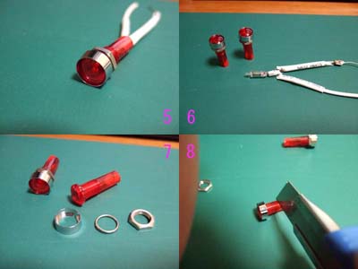 2、 メッキテールランプ 電子パーツ屋さん等で売られているパイロットランプを用意します。(画像5) 中に入っている球を取り出しバラします。(画像6、7) 長すぎるのでボディの厚みとナットが掛かる分+2〜3mmまで短くカットします。(画像8) |