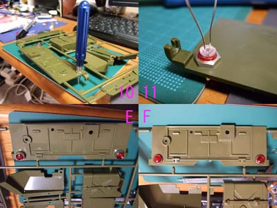 取り付けはボディにパイロットランプが入る大きさの穴を開けて取り付けますが ドリルの芯が太くなるのでボディ用のリーマが便利です。 最後に削ったLEDをSuperXで固定して取り付け完了です。(画像10、11) メッキがお好みでない方はメッキパーツを取り除くのもありですね。これも、お好みで・・・。(画像E、F) |