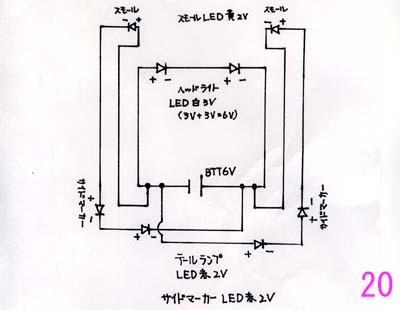 4、 配線 いよいよ配線ですが、私は抵抗を使用していません。99ライトは、白のLED2個ですので3V+3V=6Vです。 そしてテールランプ及びサイドマーカー&スモールランプは赤と黄色ですので2Vが6個です。 これを右側と左側に分けると2V+2V+2V=6Vとなりますよね。(画像20) |