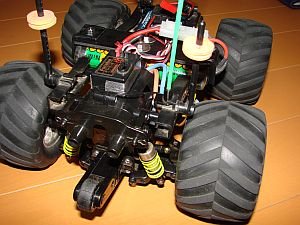 標準のバッテリー位置でオンロードサーキットをハイスピード&キレキレで走るのは難しいという結論に達し、 バッテリー搭載位置、足回り及びギア比を変更したのがオンロードコンバージョンです。 |