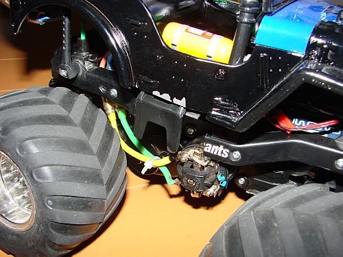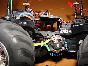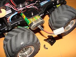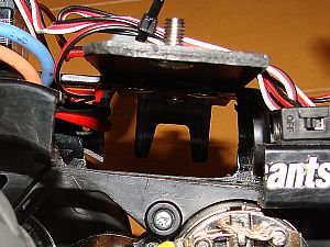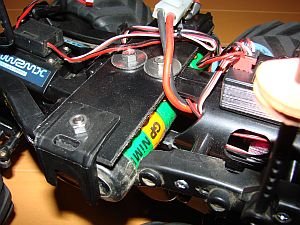 安定したフロントのグリップを確保する為にフレームを切り欠いてバッテリーを横向きに装着できるようにしました。 位置決めの板は3mm厚のカイダック。末端にTL系のバッテリー固定部品を蝶ナットで固定。 本来のバッテリー搭載位置にはアンプを入れています。 |