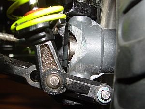 で、この仕様のポイントの1つ目はここ。TL−LAのロアアーム・Cハブ・ナックルを使用しています。 TL−LAのCハブとナックルを使用するとフロントキングピンにキャスター角が付くため、 コーナー入り口でフロントがダイブした時にもタイヤの角が路面に引っかからず、 スムーズにコーナーに進入することが出来るようになります。 これ、ノーマルWW2にもオススメのカスタムなのですが、 ナックルの写真の位置を削っておかないとCハブが1コケで割れますのでご注意を。 |