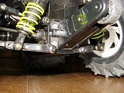 フロントのロアアームは WW2のリア用をそのまま流用すればOK。 アッパーアームとタイロッドは 3mm全ネジシャフト等で適当に自作しましょう。 写真ではダガータイヤを装着するために TL用のナックルを使用していますが、 WW2標準のナックル周りのままでもOKです。 |