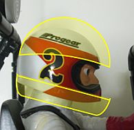 | @現物と目標形状 どう見てもキットのヘルメットはタテ方向の長さが足りないので、 図示部分をパテ盛りで形状修正します。 |
