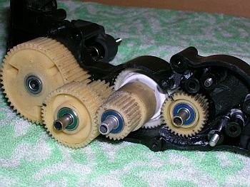 あとは、ギヤケースに収めます。カウンターギヤ(小)も、TLのものに交換します。 手で各ギヤを回して接触する部分は削り、スムーズに回るようにしましょう。[画像08、09] これで、18枚用のモーター取り付け穴で23枚ピニオンが、20枚用の穴で25枚が使えます。 (タミヤAVピニオン、0.6モジュール) 最終ギヤ比は、13.9と12.7になります。 ちなみに、OP−342 TL01スピードチューンギヤで同様に作れば、最終ギヤ比は、10.4と9.5になります。 ギヤ比を上げた(数値を小さくした)場合は、アンプ、モーター、バッテリーに負担がかかり、発熱や故障の原因になります。 なお、各レースなどに出場する時は、レギュレーションで指定ギヤ比などを確認してください。 |