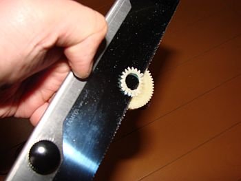次に、TL−01のスパーギヤ(SP−738、TL01 Gパーツ)を用意し、ベベルの部分を平らに削り、 反対側も1センチほど切ります。[画像04] 切る目安は、先に作ったカウンターギヤに差し込んだ時に、全長が43ミリになる様にします。 |