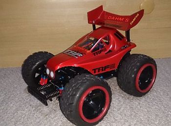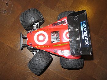 リアウイングは当初はボディーマウントの先端 (純正位置?)につけていましたが、 何度か転んで、もげそうになったりしているうちに、 いつの間にか屋根に着地(ねじ止め)。 |