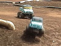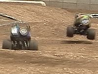 | WW2 vs Lunchbox (wmv) ランチボックス(ww2mx広報車)とワイルドウイリー2でチキってみました。 直線を普通に走らせたら明らかにランチボックスの方が速いので、 この2台をバランスさせるためにWW2にプロストック17ターン、ランチボックスにスポチュンを搭載。ご覧の通り絶妙のパワーバランスになりました。 同じファニー系マシーンながら構造も走行特性も異なるこの2台。当然ながらライン取りも全く異なるので交互にクロスラインでオーバーテイクしたりとなかなか楽しめました。 |
