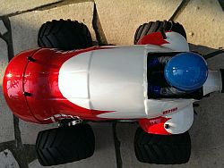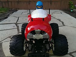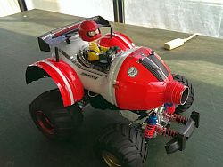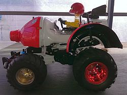 | 俺タン03号 ぴかちう@jorbangp さん(茨城県) なかなかハイクリティーなのが来ましたね! タイトルは「グランプリ”ウイリー”レーサー」 モチーフは戦前のグランプリレーサー「ブガッティT35」 ボディーは焼酎PET4.0をベースに、100円ショップで買った黒いスチレンボードに編み目模様をカッティングシートで再現したフロントグリルを装着。 軽量&超低重心故に容赦ないコーナーリングを見せるとのこと。 何かボディーマウントレスなのもイカしてますね! |