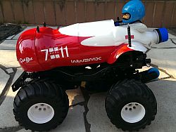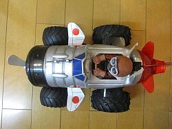| 俺タン01号 まんぺい370Z さん(千葉県) 早速食いついてくれたのは、千葉県にお住まいのまんぺい370Zさん。 ボディーは大五郎をベースにスクラッチ。 人形の首はスプリングマウントで転倒時のダメージを軽減。 正面の穴は、内部負圧による吸い込み効果を利用したエアロデバイス。 うーむ!満場一致で大バカ認定です。 |